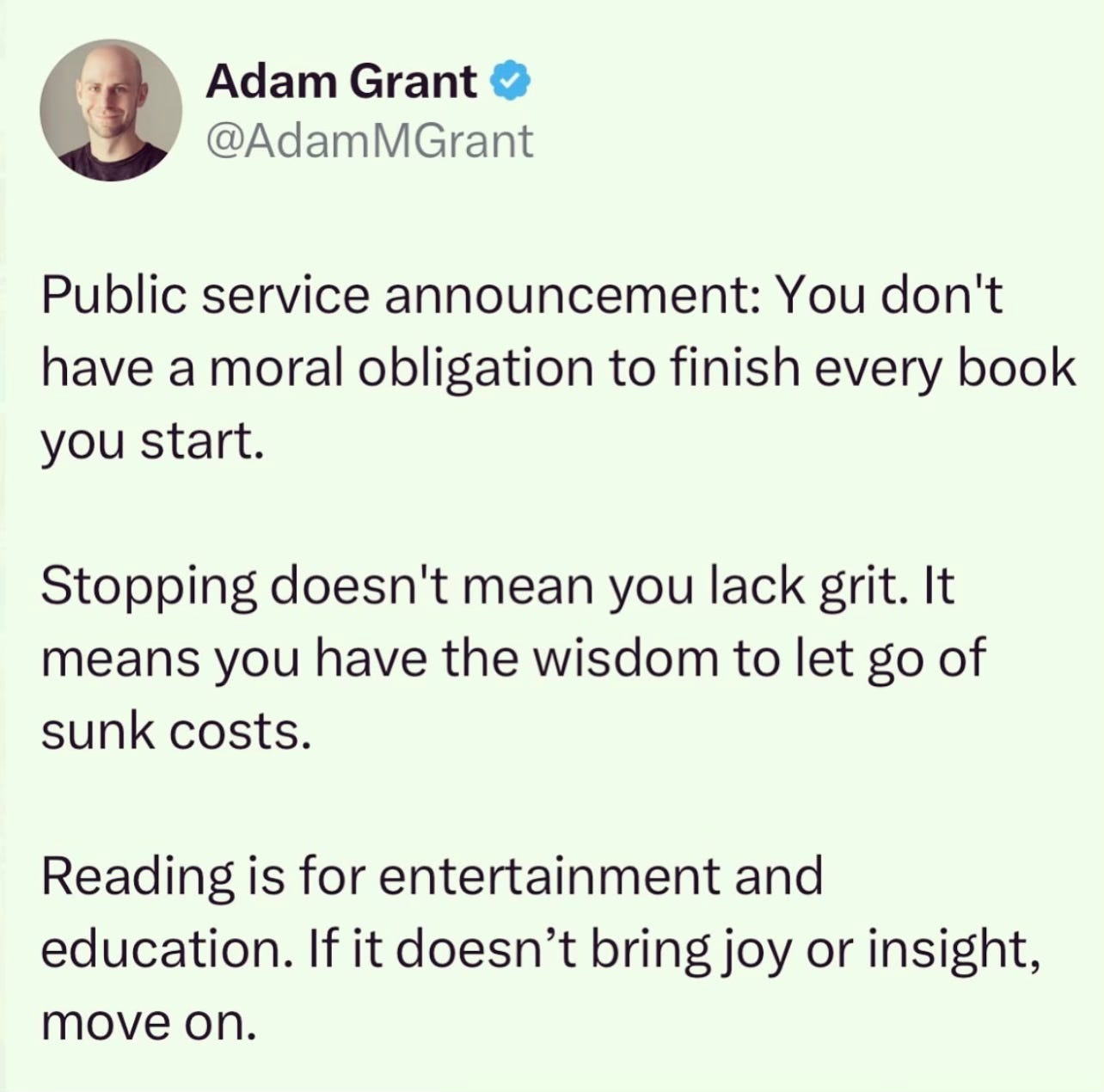 Professor Adam Grant posted a "Public service announcement: You don't have a moral obligation to finish every book you start."
